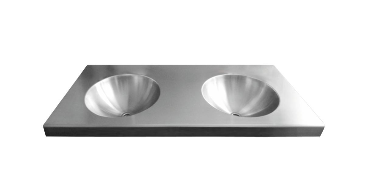 Tischplatte unterfüttert mit 1-4 fugenlos eingeschweissten runden Waschmulden Ø 360 mm,