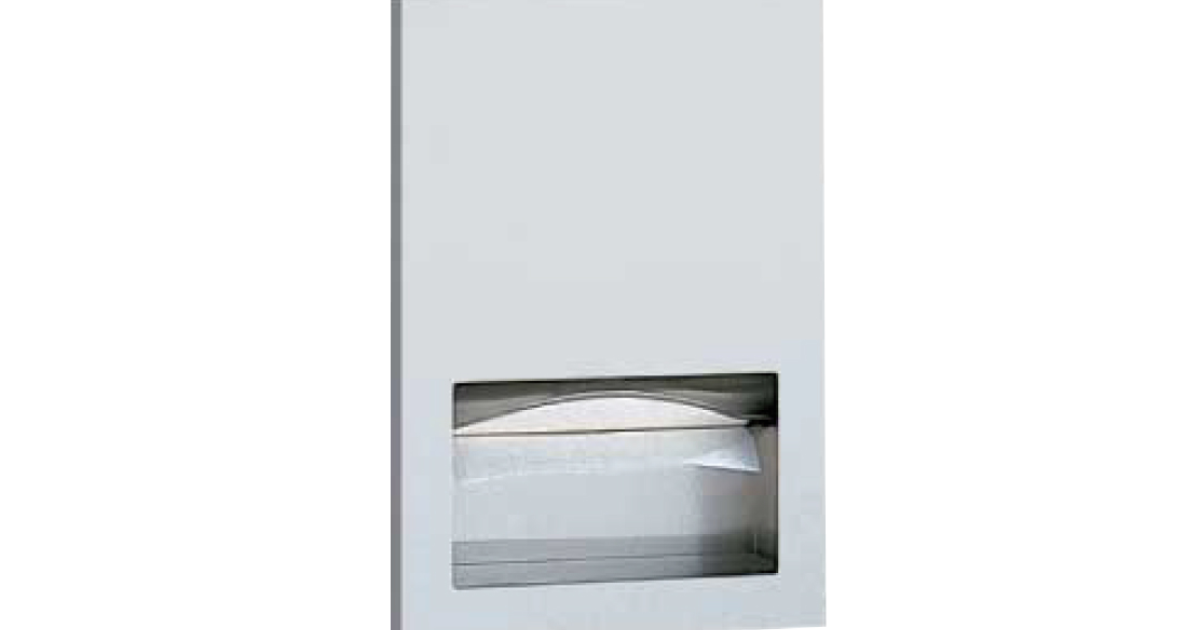 Unterputz-Papierhandtuchspender mit Zylinderschloss an der Oberseite. Die Tür öffnet sich nach unten, um die Handtücher leicht einlegen zu können. Fassungsvermögen 400-525 Stück je nach Modell und Faltmethode. Mit seitlichem Sichtschlitz für die Füllstandsanzeige.
