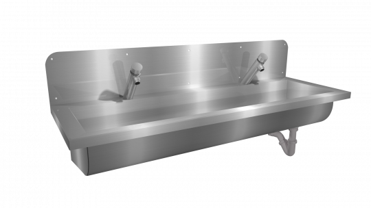 Wasgoot met of zonder spatwand, voor wandmontage, met geïntegreerde muursteunen en kraanbalk incl. Tempo kranen. Naar rechts aflopende, vlakke bodem. Wanden van de goot afgerond met aangelaste zijkant.