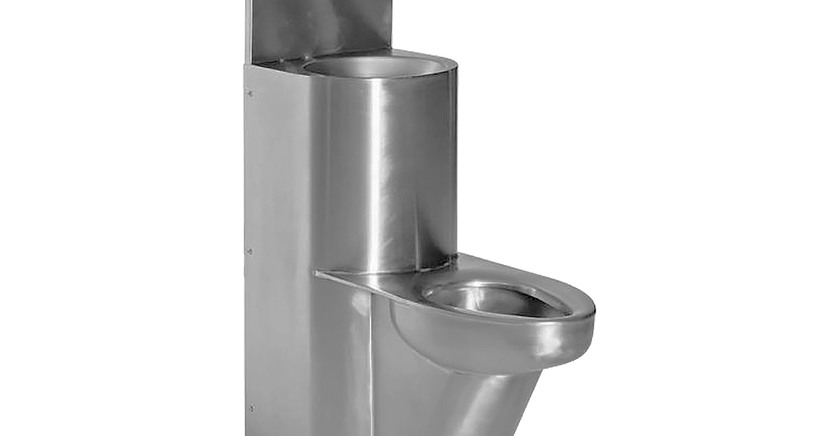 Wastafel (rond) en toilet in één naadloze constructie; wasbak voorzien van ingeperst gaatjesrooster; binnenkant meubel voorzien van geluiddempende strips. De onderkant van de spoelrand is zo ontworpen dat het verwonden bij de inspectie en